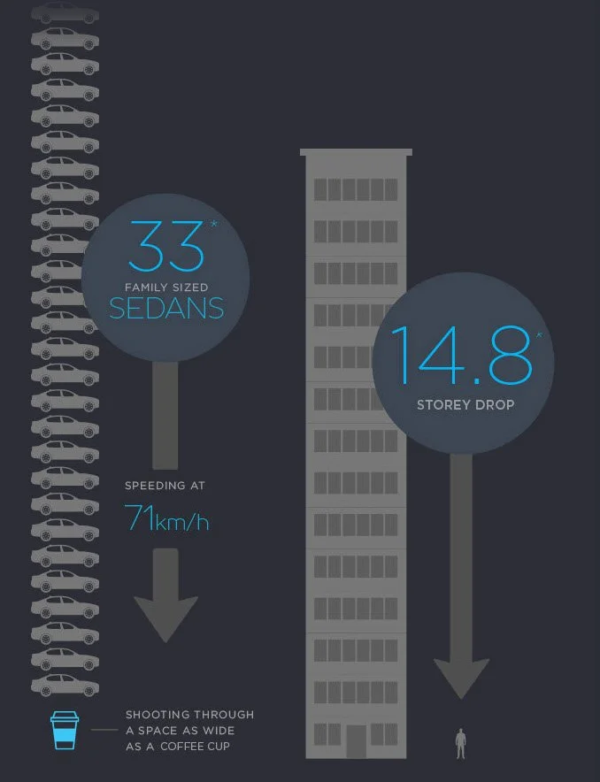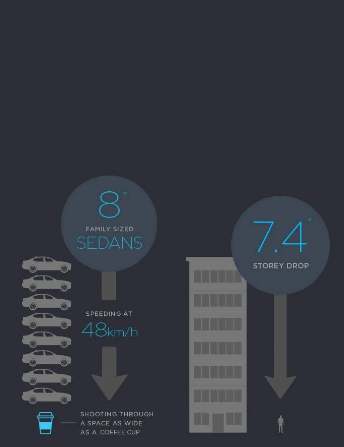 *Above is a sample of the tests the SafetySpear™ has been through during the testing phase and should not be interpreted as everyday operational maximum limits. While every care has been taken to be as accurate as possible, variations will exist. These figures are for illustration purposes only and are an approximation of initial contact forces/speed/energy generated. These suggested figures are for comparisons between different scenarios. It is acknowledged that some calculations in force will have different outcomes. Average storey height is 2.7 metres. Average sedan weight 1.5 tonnes